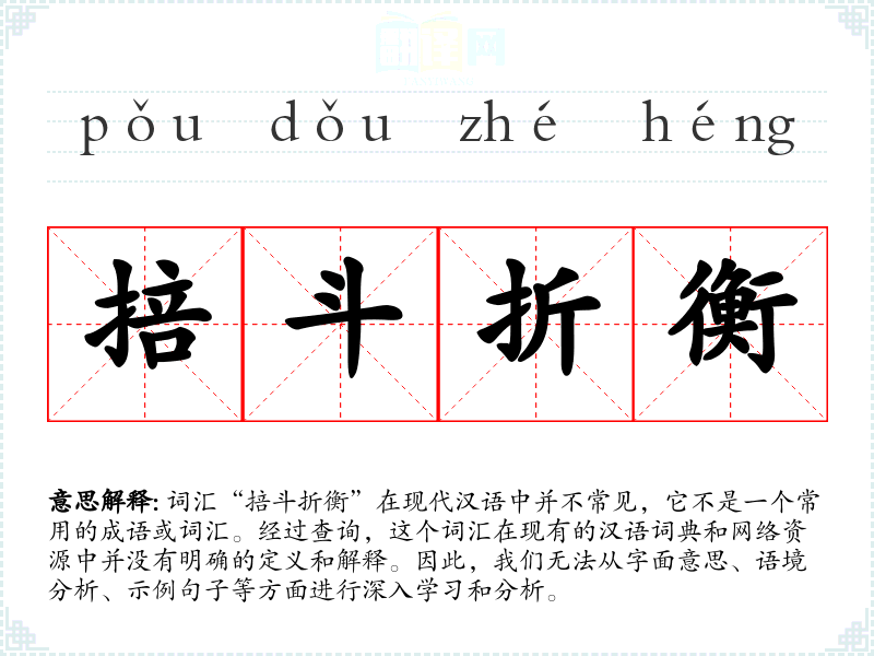 词汇“掊斗折衡”在现代汉语中并不常见,它不是一个常用的成语或词汇。经过查询,这个词汇在现有的汉语词典和网络资源中并没有明确的定义和解释。因此,我们无法从字面意思、语境分析、示例句子等方面进行深入学习和分析。