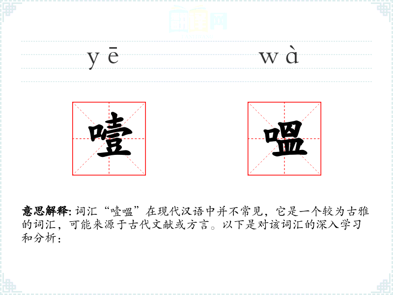 词汇“噎嗢”在现代汉语中并不常见,它是一个较为古雅的词汇,可能来源于古代文献或方言。以下是对该词汇的深入学习和分析: