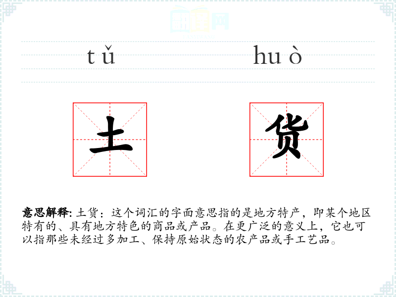 土货:这个词汇的字面意思指的是地方特产,即某个地区特有的、具有地方特色的商品或产品。在更广泛的意义上,它也可以指那些未经过多加工、保持原始状态的农产品或手工艺品。