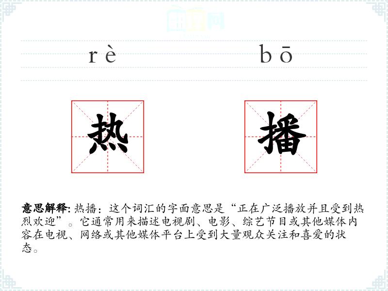 热播:这个词汇的字面意思是“正在广泛播放并且受到热烈欢迎”。它通常用来描述电视剧、电影、综艺节目或其他媒体内容在电视、网络或其他媒体平台上受到大量观众关注和喜爱的状态。