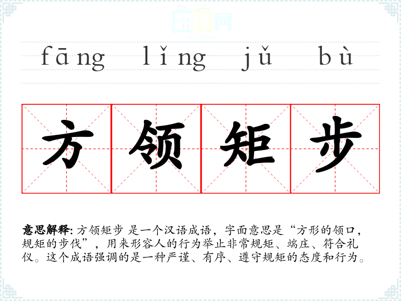 方领矩步 这个成语在*文化中占有重要地位,它不仅描述了一种行为方式,也反映了社会对礼仪和规矩的重视。在学汉语和理解**文化时,了解和掌握这样的成语是非常重要的。它不仅丰富了语言表达,也加深了对文化传统的理解。