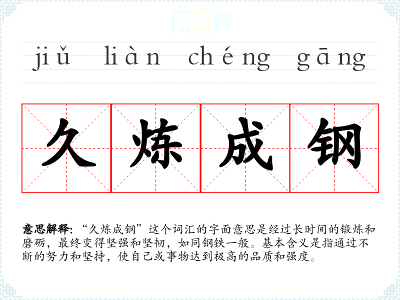 “久炼成钢”这个词汇的字面意思是经过长时间的锻炼和磨砺,最终变得坚强和坚韧,如同钢铁一般。基本含义是指通过不断的努力和坚持,使自己或事物达到极高的品质和强度。