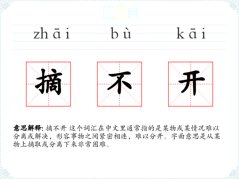 摘不开 这个词汇在中文里通常指的是某物或某情况难以分离或解决,形容事物之间紧密相连,难以分开。字面意思是从某物上摘取或分离下来非常困难。