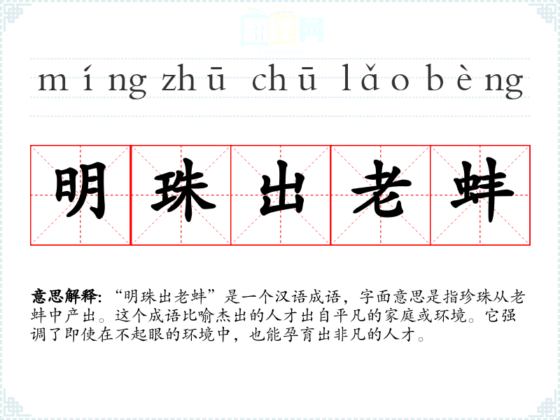 - 口语:在日常对话中,人们可能用这个成语来鼓励那些来自普通家庭的孩子,如“别小看他,他可是明珠出老蚌,将来一定有出息。”
