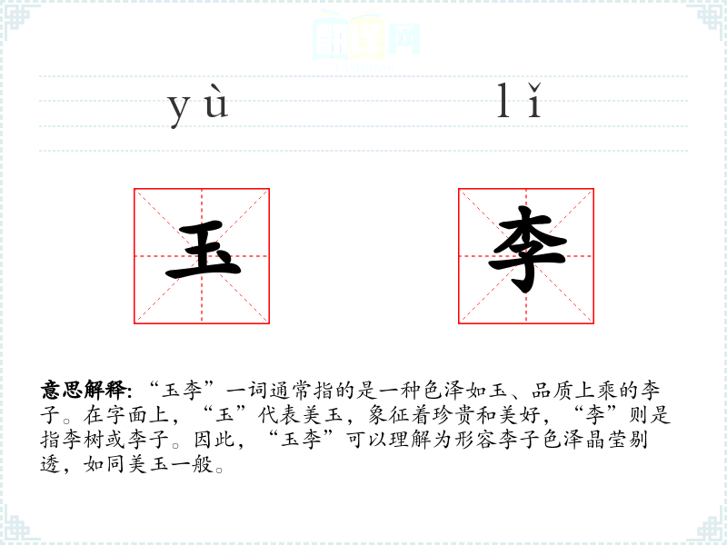 - 反义词:劣李、酸李(与“玉李”相对,指品质不佳的李子)