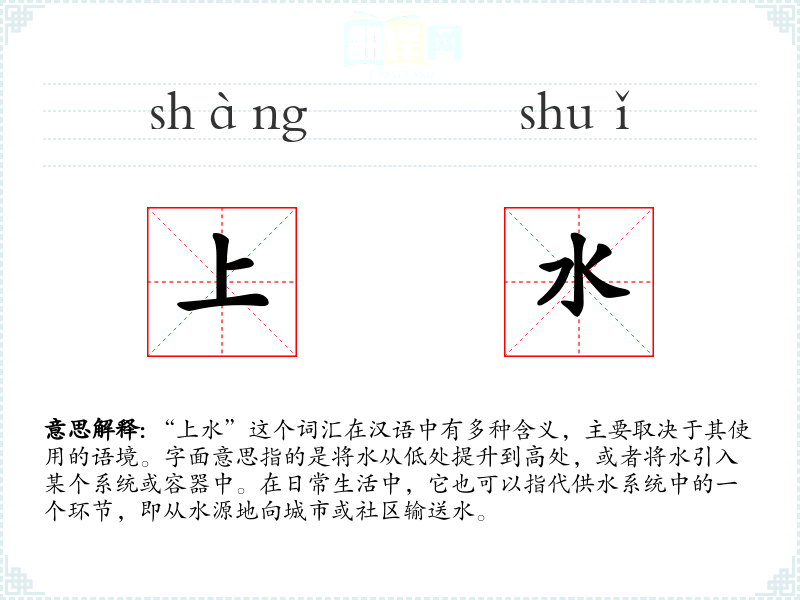 - 口语语境:在日常对话中,“上水”可能简单地指代给某个容器加水,如“给花盆上水”。