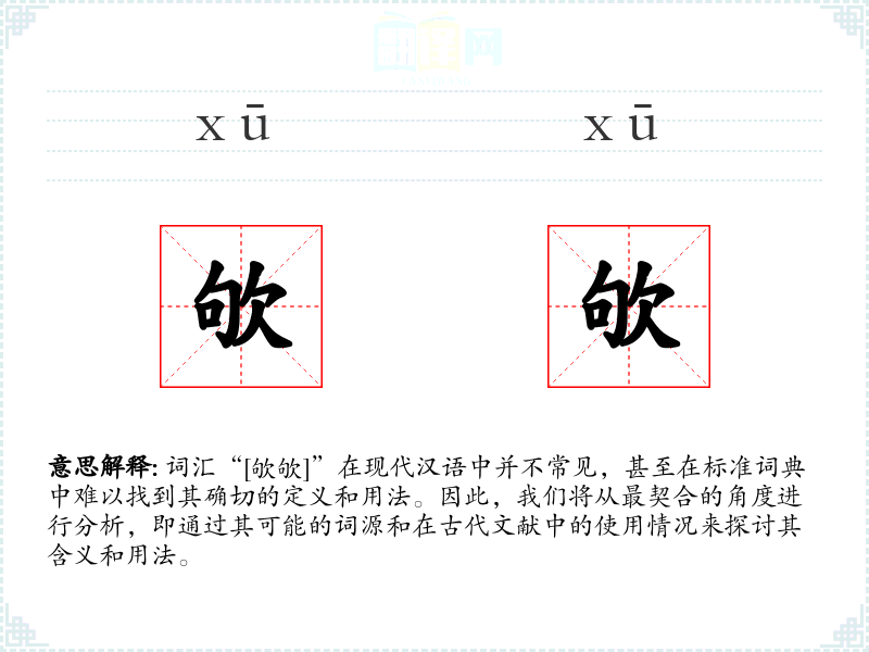 词汇“[欨欨]”在现代汉语中并不常见,甚至在标准词典中难以找到其确切的定义和用法。因此,我们将从最契合的角度进行分析,即通过其可能的词源和在古代文献中的使用情况来探讨其含义和用法。
