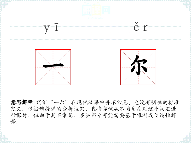 由于“一尔”不是一个标准词汇,它的字面意思和基本含义难以确定。如果强行解释,“一”通常表示数量上的“一个”,“尔”在古汉语中可以指代“你”,但这样的组合在现代汉语中没有明确意义。