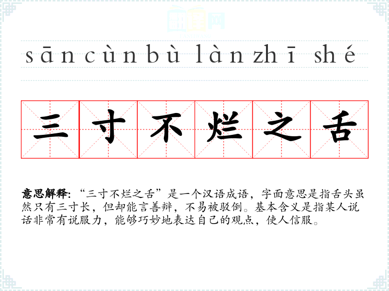 “三寸不烂之舌”是一个汉语成语,字面意思是指舌头虽然只有三寸长,但却能言善辩,不易被驳倒。基本含义是指某人说话非常有说服力,能够巧妙地表达自己的观点,使人信服。