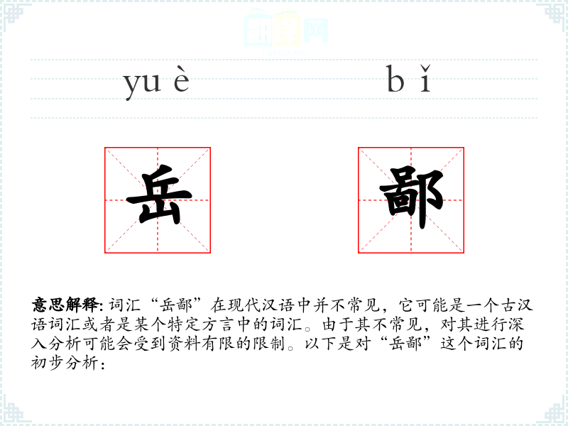 词汇“岳鄙”在现代汉语中并不常见,它可能是一个古汉语词汇或者是某个特定方言中的词汇。由于其不常见,对其进行深入分析可能会受到资料有限的限制。以下是对“岳鄙”这个词汇的初步分析: