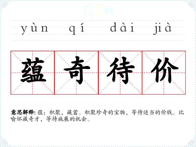 蕴:积聚,藏蓄。积聚珍奇的宝物,等待适当的价钱。比喻怀藏奇才,等待施展的机会。