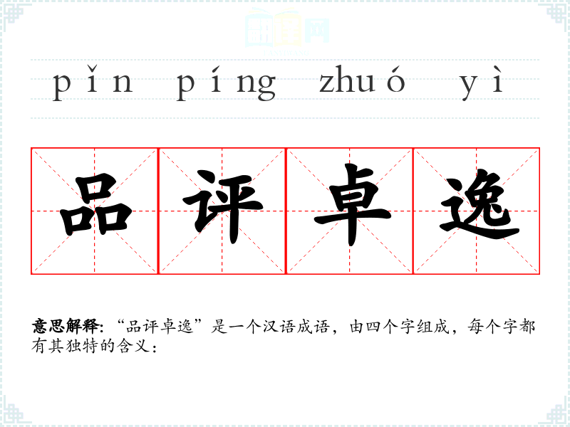 “品评卓逸”是一个汉语成语,由四个字组成,每个字都有其独特的含义:
