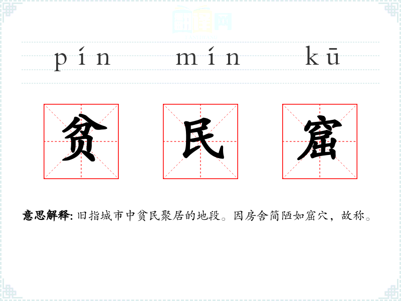 旧指城市中贫民聚居的地段。因房舍简陋如窟穴,故称。