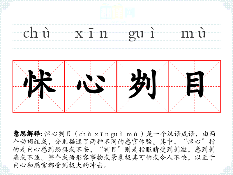 怵心刿目(chù xīn guì mù)是一个汉语成语,由两个动词组成,分别描述了两种不同的感官体验。其中,“怵心”指的是内心感到恐惧或不安,“刿目”则是指眼睛受到刺激,感到刺痛或不适。整个成语形容事物或景象极其可怕或令人不快,以至于内心和感官都受到极大的冲击。