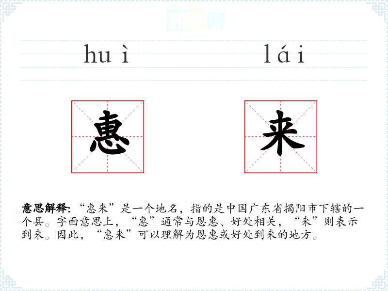 “惠来”是一个地名,指的是**广东省揭阳市下辖的一个县。字面意思上,“惠”通常与恩惠、好处相关,“来”则表示到来。因此,“惠来”可以理解为恩惠或好处到来的地方。
