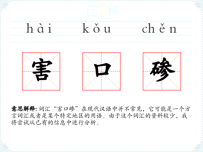 词汇“害口碜”在现代汉语中并不常见,它可能是一个方言词汇或者是某个特定地区的用语。由于这个词汇的资料较少,我将尝试从已有的信息中进行分析。