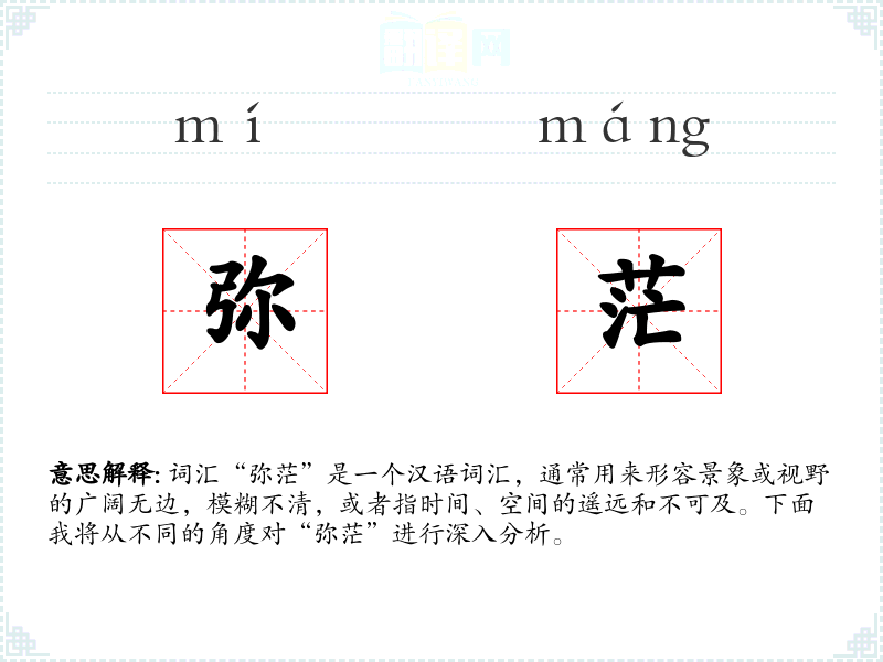 “弥茫”字面意思是指广阔而模糊,难以辨认或触及的状态。其中,“弥”有广泛、遍布的意思,“茫”则表示模糊、不清楚。