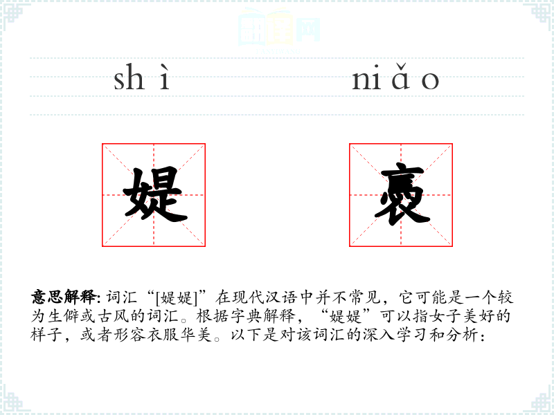 词汇“[媞媞]”在现代汉语中并不常见,它可能是一个较为生僻或古风的词汇。根据字典解释,“媞媞”可以指女子美好的样子,或者形容衣服华美。以下是对该词汇的深入学习和分析: