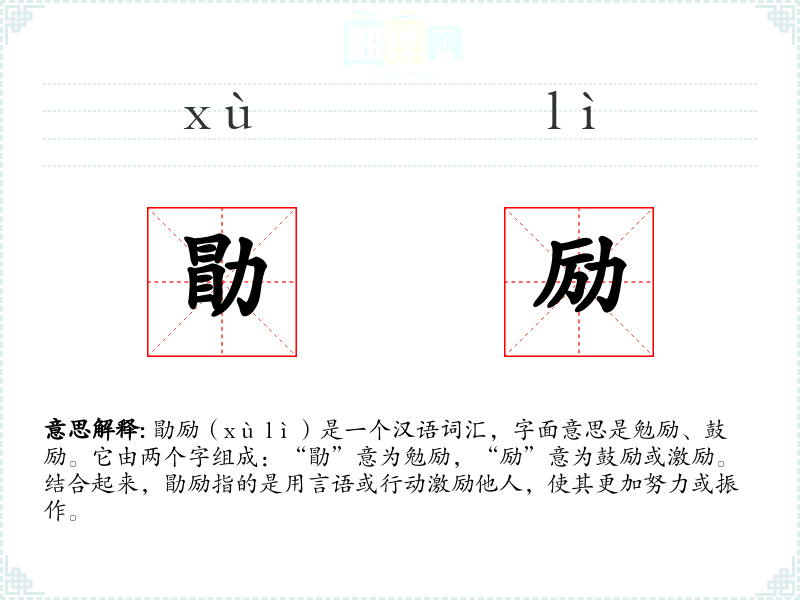 勖励(xù lì)是一个汉语词汇,字面意思是勉励、鼓励。它由两个字组成:“勖”意为勉励,“励”意为鼓励或激励。结合起来,勖励指的是用言语或行动激励他人,使其更加努力或振作。