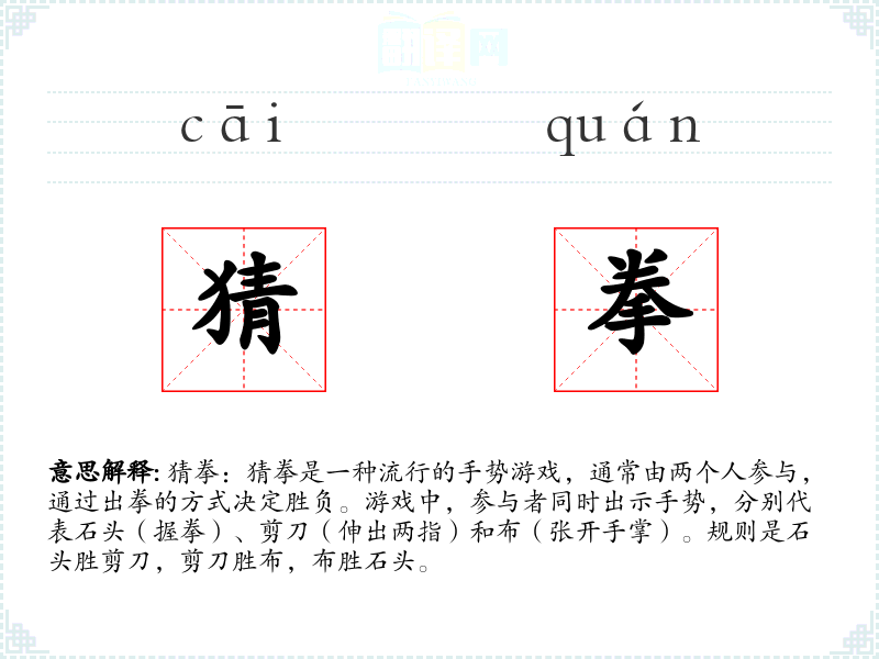 同义词:石头剪刀布、手势游戏 反义词:无直接反义词,但可以与“确定”、“固定”等词形成对比。