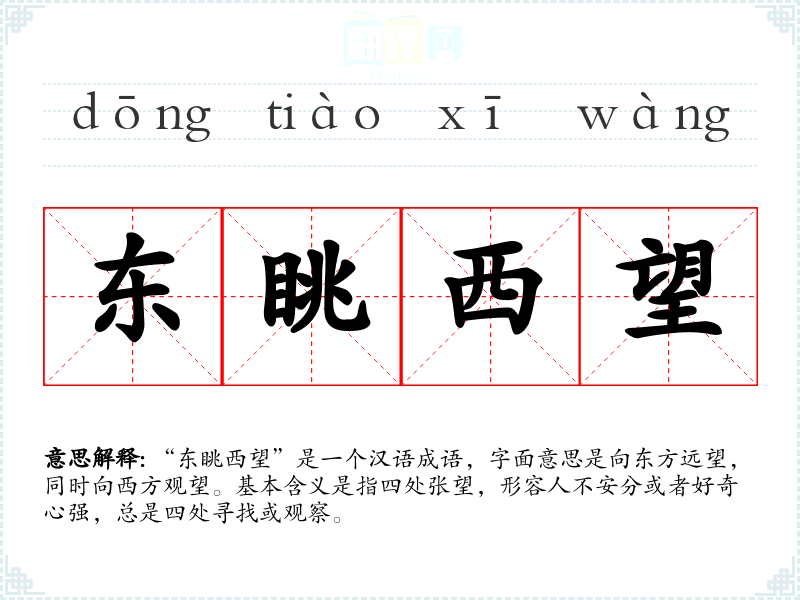 “东眺西望”是一个汉语成语,字面意思是向东方远望,同时向西方观望。基本含义是指四处张望,形容人不安分或者好奇心强,总是四处寻找或观察。