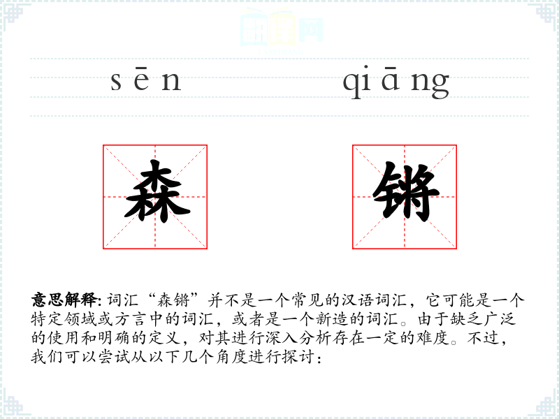 由于“森锵”不是一个标准汉语词汇,我们无法给出确切的字面意思和基本含义。它可能是由“森”(森林)和“锵”(金属撞击声)两个字组合而成的新词,具体含义需要根据上下文来判断。