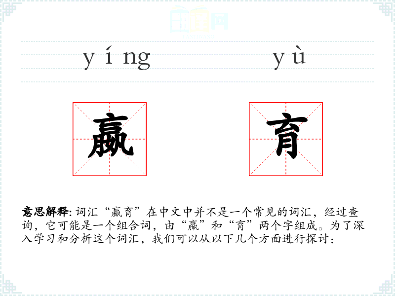 词汇“嬴育”在中文中并不是一个常见的词汇,经过查询,它可能是一个组合词,由“嬴”和“育”两个字组成。为了深入学*和分析这个词汇,我们可以从以下几个方面进行探讨: