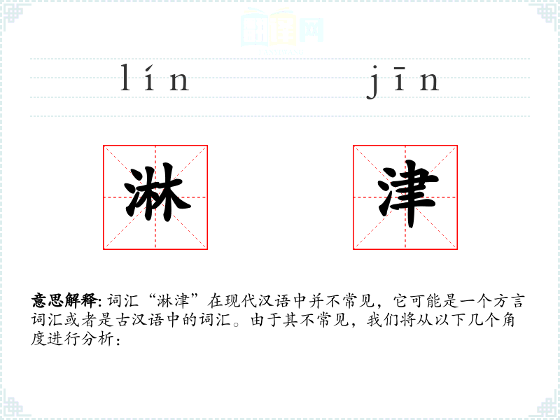 词汇“淋津”在现代汉语中并不常见,它可能是一个方言词汇或者是古汉语中的词汇。由于其不常见,我们将从以下几个角度进行分析: