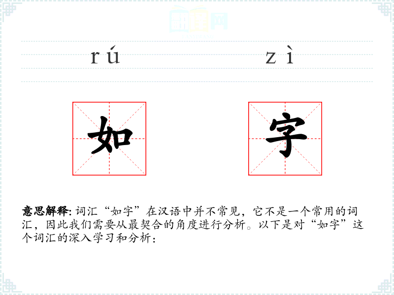 词汇“如字”在汉语中并不常见,它不是一个常用的词汇,因此我们需要从最契合的角度进行分析。以下是对“如字”这个词汇的深入学*和分析:
