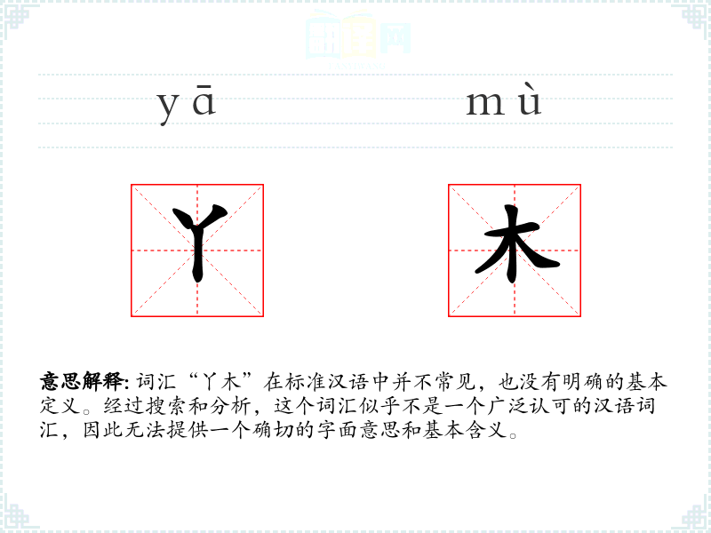 词汇“丫木”在标准汉语中并不常见,也没有明确的基本定义。经过搜索和分析,这个词汇似乎不是一个广泛认可的汉语词汇,因此无法提供一个确切的字面意思和基本含义。