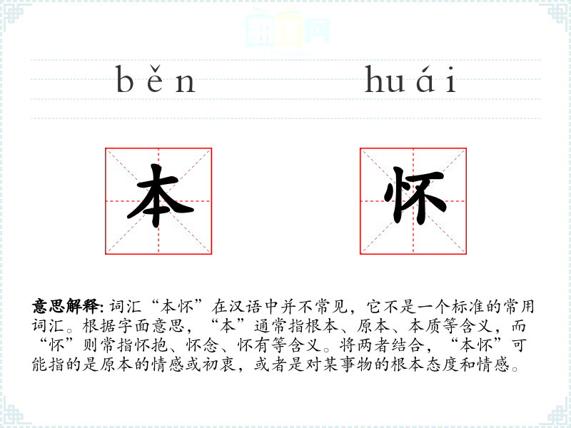 词汇“本怀”在汉语中并不常见,它不是一个标准的常用词汇。根据字面意思,“本”通常指根本、原本、本质等含义,而“怀”则常指怀抱、怀念、怀有等含义。将两者结合,“本怀”可能指的是原本的情感或初衷,或者是对某事物的根本态度和情感。
