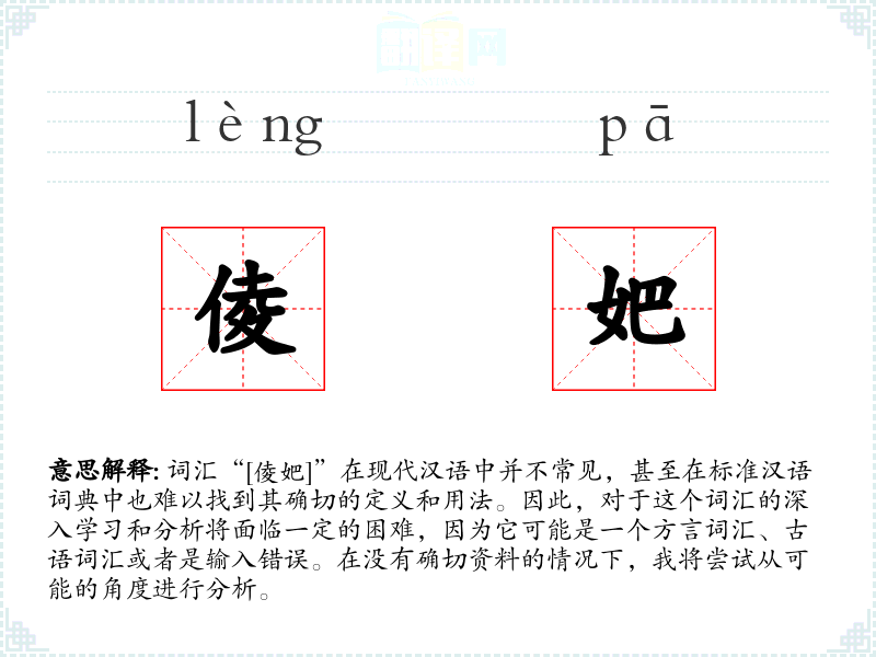 词汇“[倰妑]”在现代汉语中并不常见,甚至在标准汉语词典中也难以找到其确切的定义和用法。因此,对于这个词汇的深入学习和分析将面临一定的困难,因为它可能是一个方言词汇、古语词汇或者是输入错误。在没有确切资料的情况下,我将尝试从可能的角度进行分析。