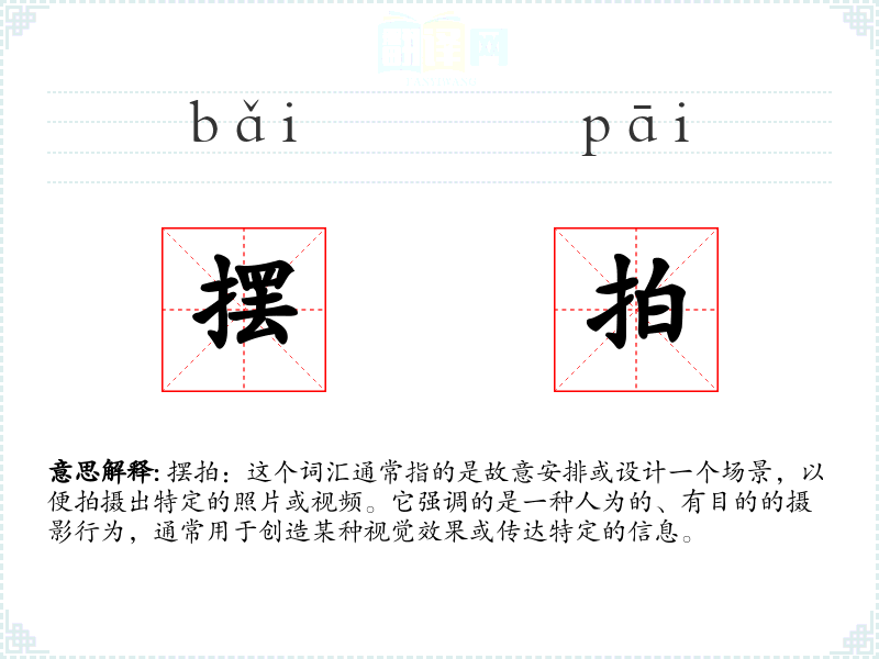 "摆拍"的意思解释、摆拍是什么意思由翻译网汉语词典查词提供。
