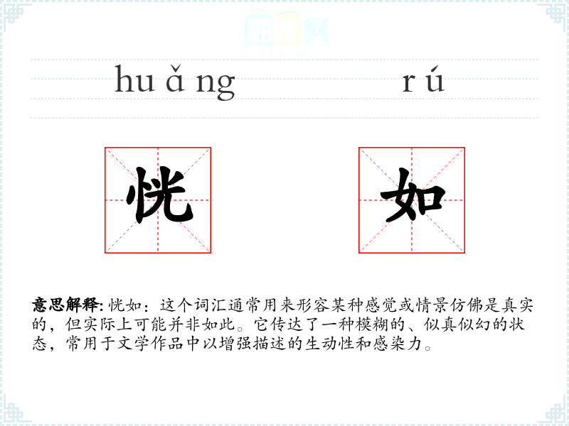 恍如:这个词汇通常用来形容某种感觉或情景仿佛是真实的,但实际上可能并非如此。它传达了一种模糊的、似真似幻的状态,常用于文学作品中以增强描述的生动性和感染力。