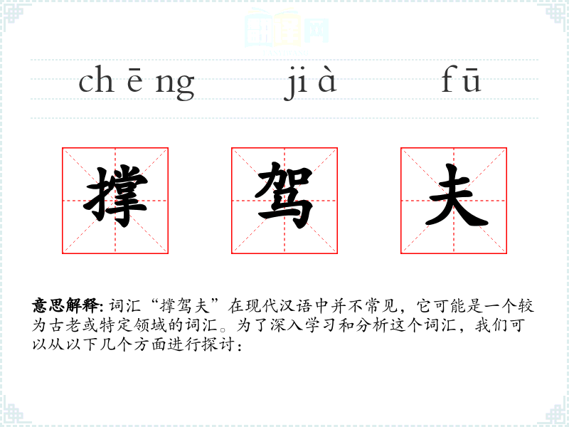 词汇“撑驾夫”在现代汉语中并不常见,它可能是一个较为古老或特定领域的词汇。为了深入学习和分析这个词汇,我们可以从以下几个方面进行探讨: