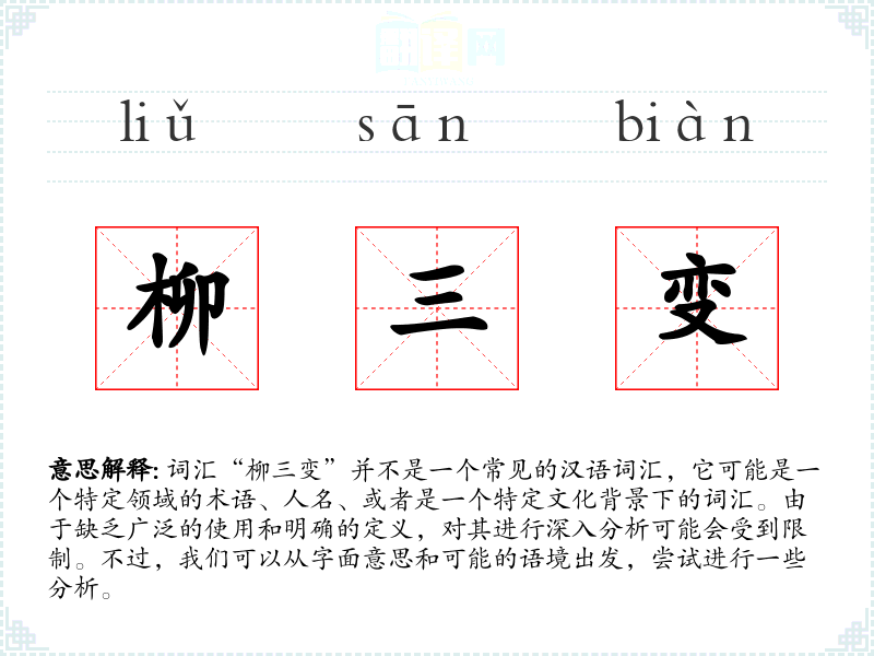 词汇“柳三变”并不是一个常见的汉语词汇,它可能是一个特定领域的术语、人名、或者是一个特定文化背景下的词汇。由于缺乏广泛的使用和明确的定义,对其进行深入分析可能会受到限制。不过,我们可以从字面意思和可能的语境出发,尝试进行一些分析。