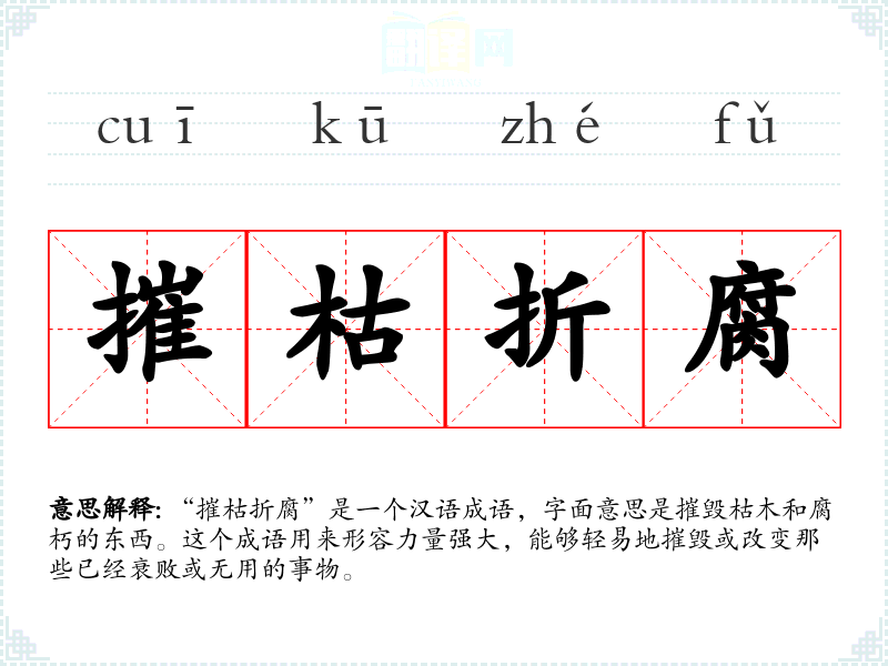 “摧枯折腐”是一个汉语成语,字面意思是摧毁枯木和腐朽的东西。这个成语用来形容力量强大,能够轻易地摧毁或改变那些已经衰败或无用的事物。