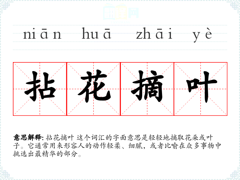 拈花摘叶 这个词汇的字面意思是轻轻地摘取花朵或叶子。它通常用来形容人的动作轻柔、细腻,或者比喻在众多事物中挑选出最精华的部分。