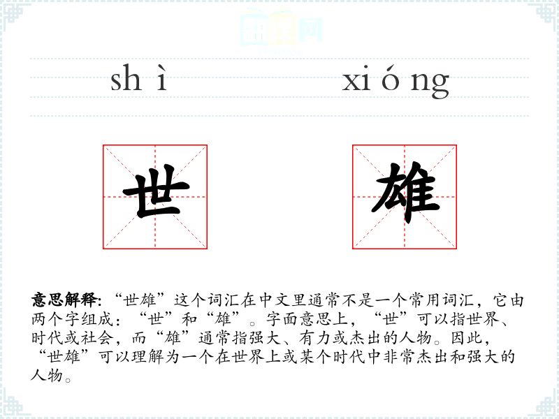 由于“世雄”不是一个常用词汇,它在文学、口语或专业领域中的使用相对较少。在文学作品中,可能会用来形容一个历史上的伟大领袖或英雄人物。在口语中,这个词汇可能不太常见,除非是在讨论历史或英雄人物时。