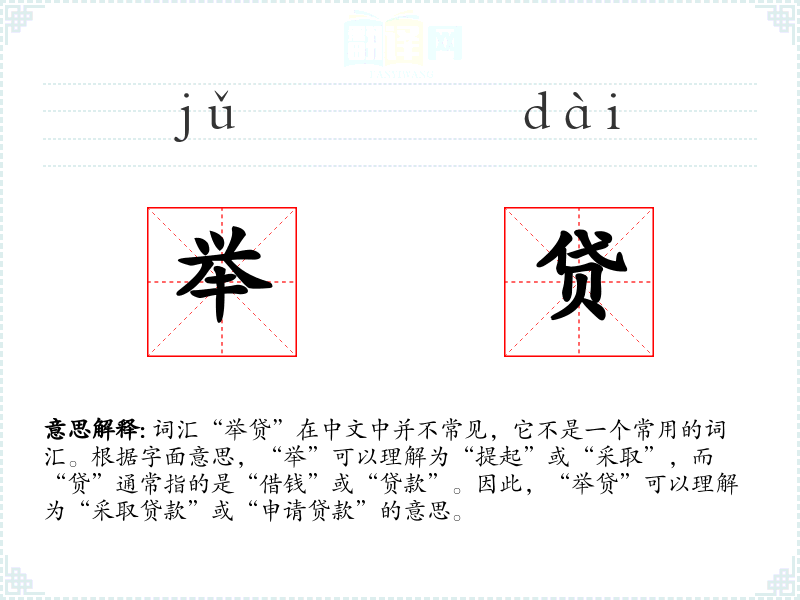 词汇“举贷”在中文中并不常见,它不是一个常用的词汇。根据字面意思,“举”可以理解为“提起”或“采取”,而“贷”通常指的是“借钱”或“贷款”。因此,“举贷”可以理解为“采取贷款”或“申请贷款”的意思。