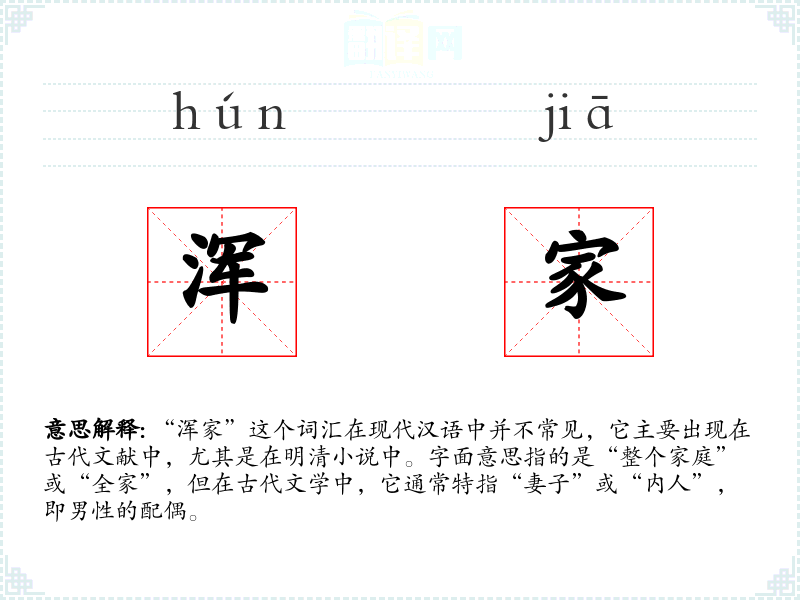 “浑家”这个词汇在现代汉语中并不常见,它主要出现在古代文献中,尤其是在明清小说中。字面意思指的是“整个家庭”或“全家”,但在古代文学中,它通常特指“妻子”或“内人”,即男性的配偶。