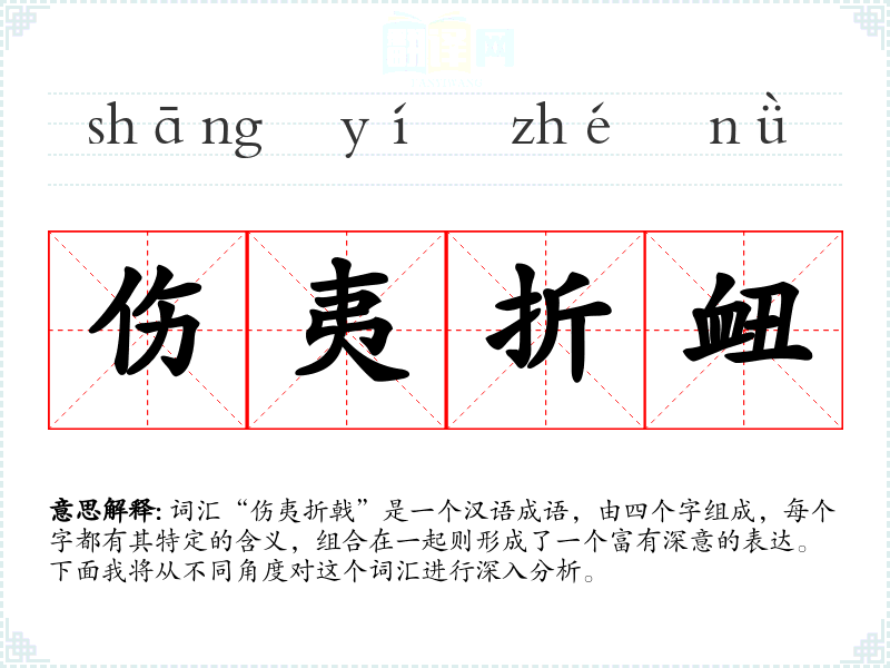 词汇“伤夷折戟”是一个汉语成语,由四个字组成,每个字都有其特定的含义,组合在一起则形成了一个富有深意的表达。下面我将从不同角度对这个词汇进行深入分析。