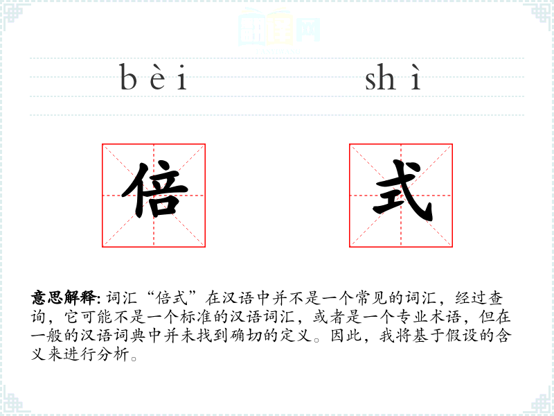 词汇“倍式”在汉语中并不是一个常见的词汇,经过查询,它可能不是一个标准的汉语词汇,或者是一个专业术语,但在一般的汉语词典中并未找到确切的定义。因此,我将基于假设的含义来进行分析。