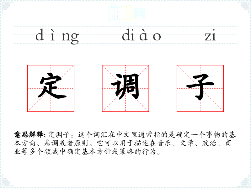定调子:这个词汇在中文里通常指的是确定一个事物的基本方向、基调或者原则。它可以用于描述在音乐、文学、政治、商业等多个领域中确定基本方针或策略的行为。