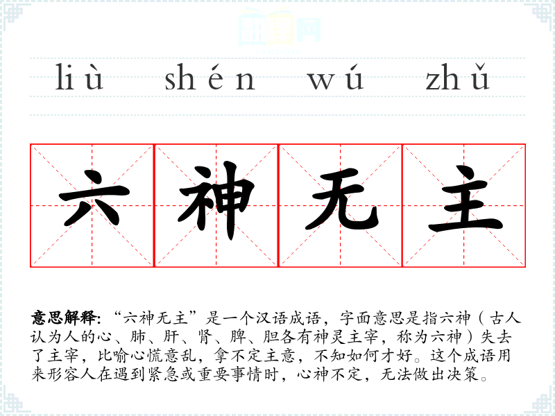 “六神无主”是一个汉语成语,字面意思是指六神(古人认为人的心、肺、肝、肾、脾、胆各有神灵主宰,称为六神)失去了主宰,比喻心慌意乱,拿不定主意,不知如何才好。这个成语用来形容人在遇到紧急或重要事情时,心神不定,无法做出决策。