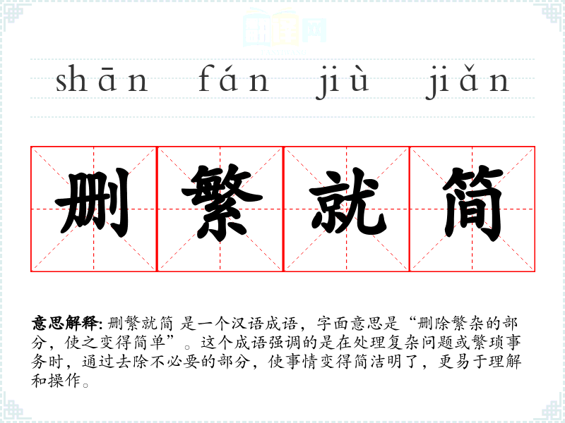 删繁就简 是一个汉语成语,字面意思是“删除繁杂的部分,使之变得简单”。这个成语强调的是在处理复杂问题或繁琐事务时,通过去除不必要的部分,使事情变得简洁明了,更易于理解和操作。
