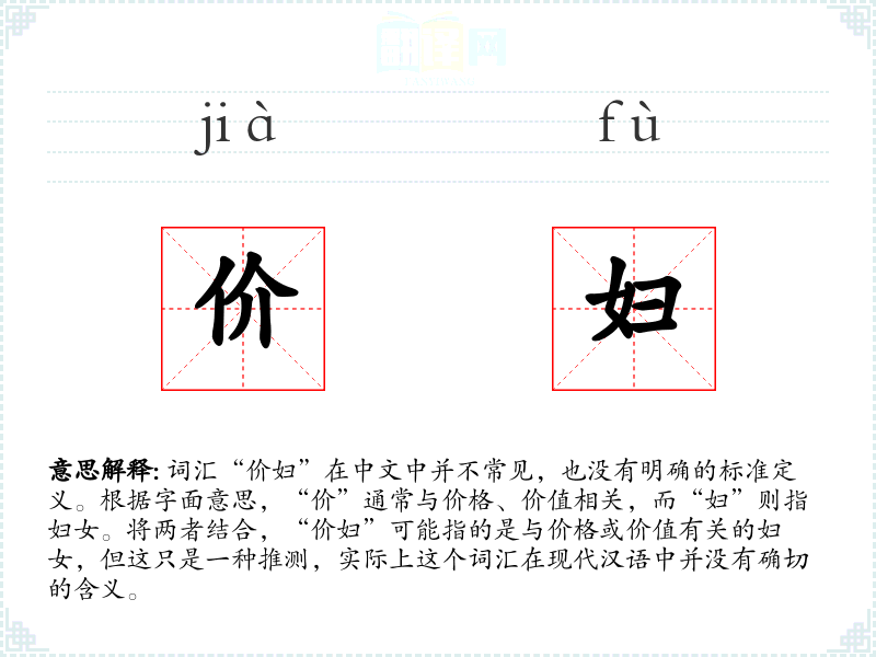 文化与社会背景: 在特定的文化或社会背景中,“价妇”可能会有特定的含义,但这需要具体的语境来解释。在没有具体语境的情况下,这个词汇的意义是不明确的。
