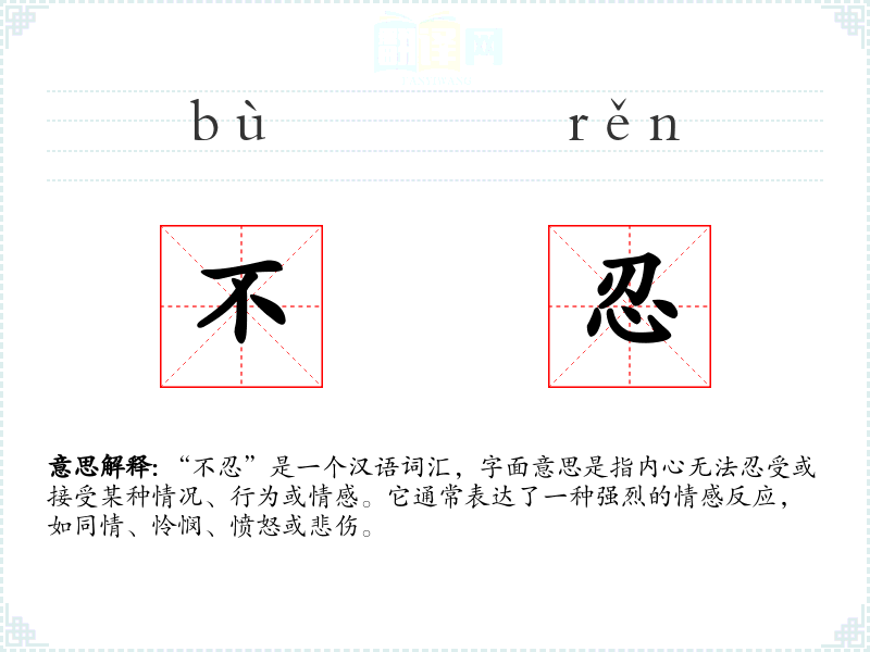 - 专业领域:在心理学或伦理学中,“不忍”可能涉及对道德困境的讨论,如“医生在面对生死抉择时,常常感到不忍”。