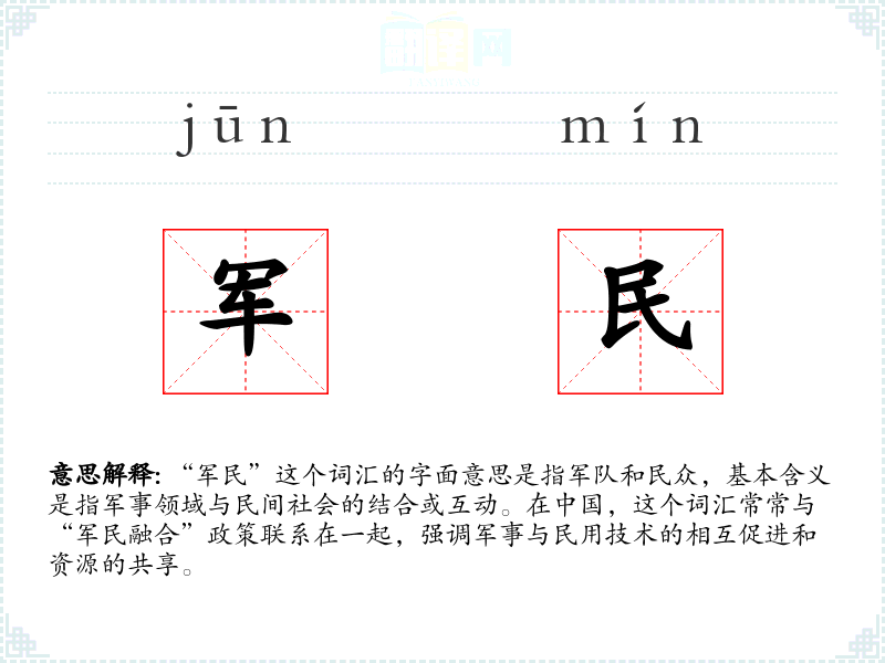 “军民”这个词汇不仅代表了军事与民间的结合,也象征着国家战略和社会发展的方向。在我的语言学*和表达中,理解和运用这个词汇有助于我更好地把握国家政策和社会动态,同时也丰富了我的词汇量和表达能力。