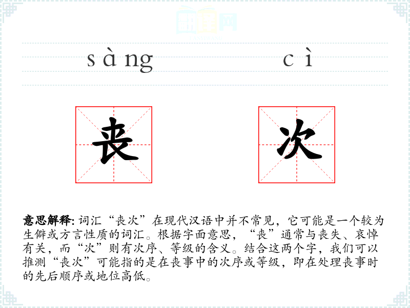 词汇“丧次”在现代汉语中并不常见,它可能是一个较为生僻或方言性质的词汇。根据字面意思,“丧”通常与丧失、哀悼有关,而“次”则有次序、等级的含义。结合这两个字,我们可以推测“丧次”可能指的是在丧事中的次序或等级,即在处理丧事时的先后顺序或地位高低。